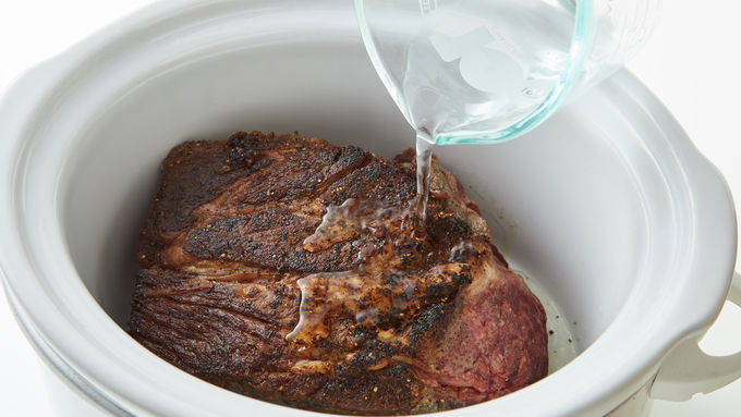 Transfer to slow cooker; pour 1/4 cup water over roast. Cover and cook on Low heat setting 7 to 8 hours or until beef is tender and easy to shred.